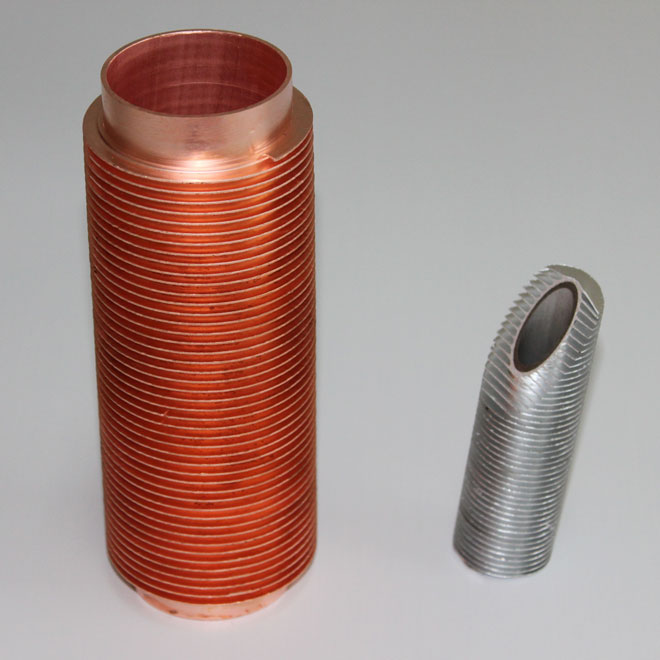 Izrađuju se od čeličnih, bakrenih ili INOX cijevi na koje su navučene aluminijske, čelične, bakrene ili INOX lamele s različitim korakom ili na koje je namotana spirala, također s razlličitim korakom. Orebrene cijevi lamelne ili spiralne zavarene su na temeljne ploče kao i sabirne komore na kojima su dva cijevna priključka s navojem, s prirubnicama ili kontraprirubnicama po želji. Ovakav izmjenjivač topline je sastavni dio termičkog uređaja za grijanje prostora toplim zrakom ili hlađenje medija unutar određenog procesa.